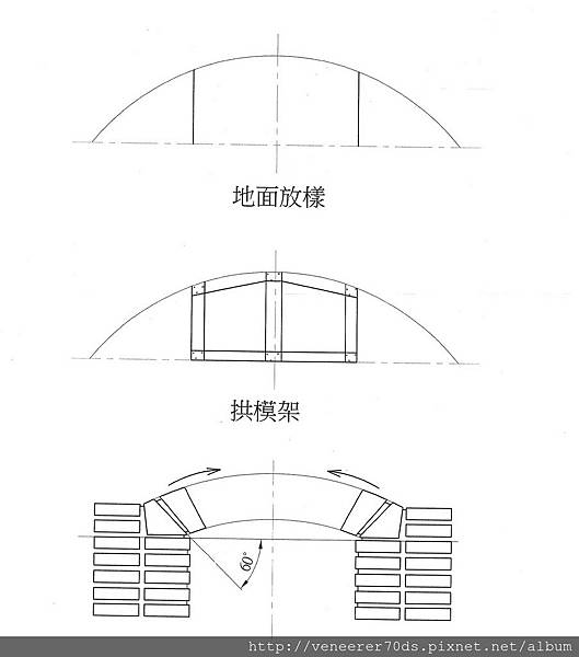 於地面製作出一個1:1等比例之拱樣品模板,並注意核對其拱弧的中心點。